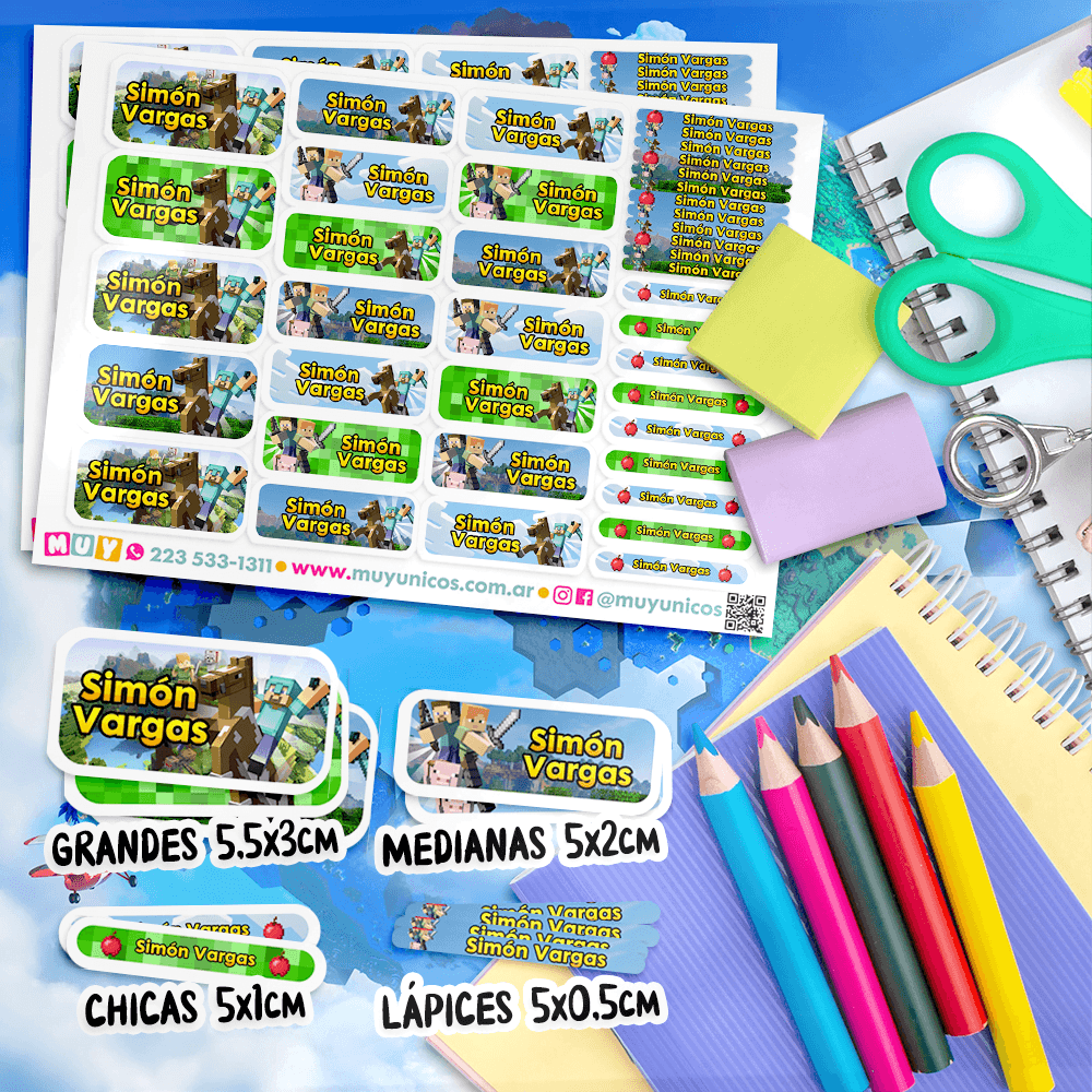 Recibe un kit de etiquetas escolares personalizadas con el nombre que elijas, listas para imprimir. Diseñamos este set a mano para ti y te lo enviamos en un archivo PDF. Este práctico archivo digital en formato PDF de 14 páginas te permite imprimir las etiquetas que necesites, en el tamaño que quieras y cuantas veces desees. Tu compra incluye: Más de mil etiquetas personalizadas de distintos tamaños, diseñadas para adaptarse a todos los útiles y objetos personales. Etiquetas (5×3 cm): Ideales para cuadernos, carpetas, estuches, mochilas y loncheras. Etiquetas (5×2 cm): Perfectas para reglas, marcadores gruesos, sacapuntas, agendas y pegamento…